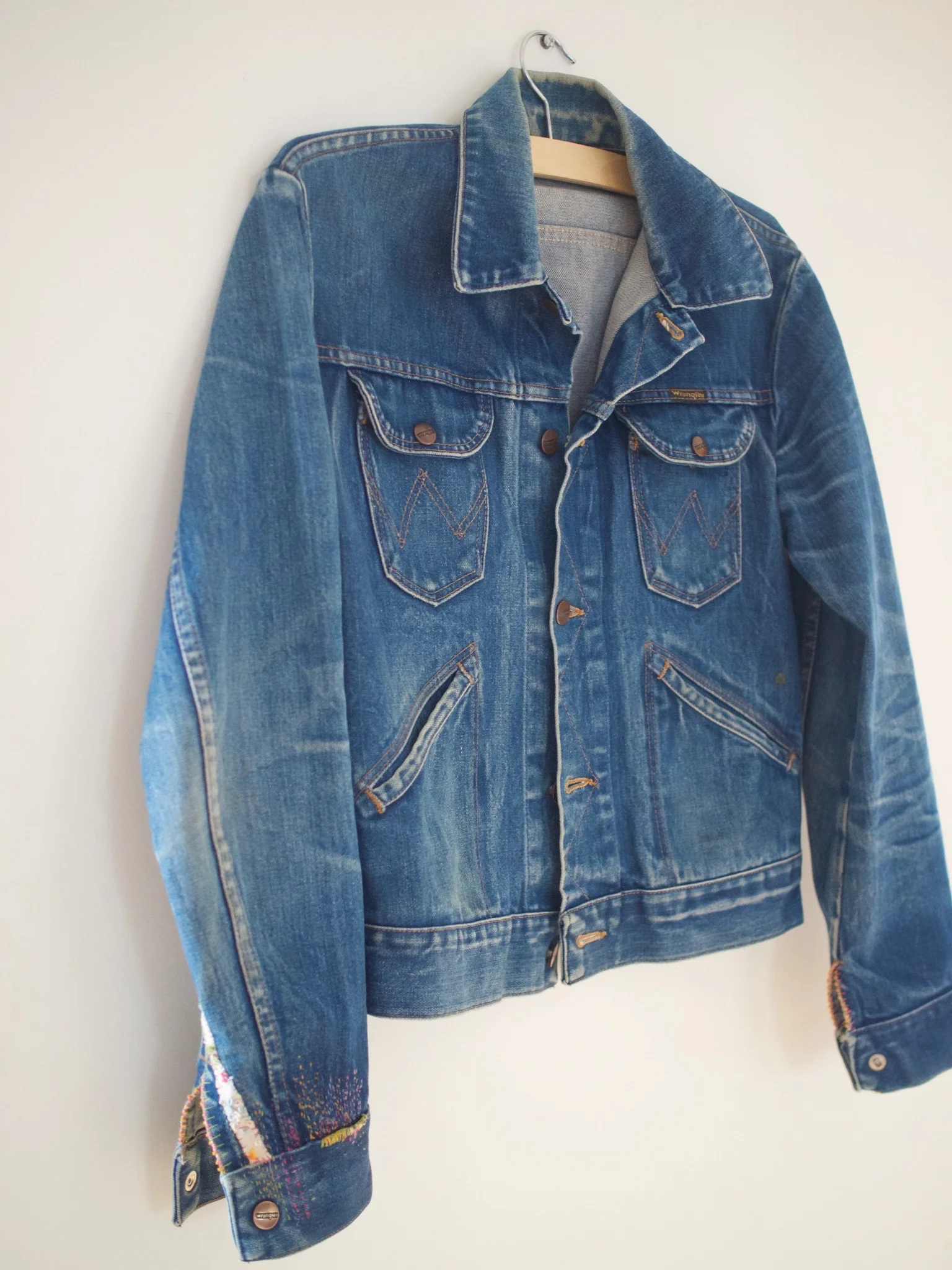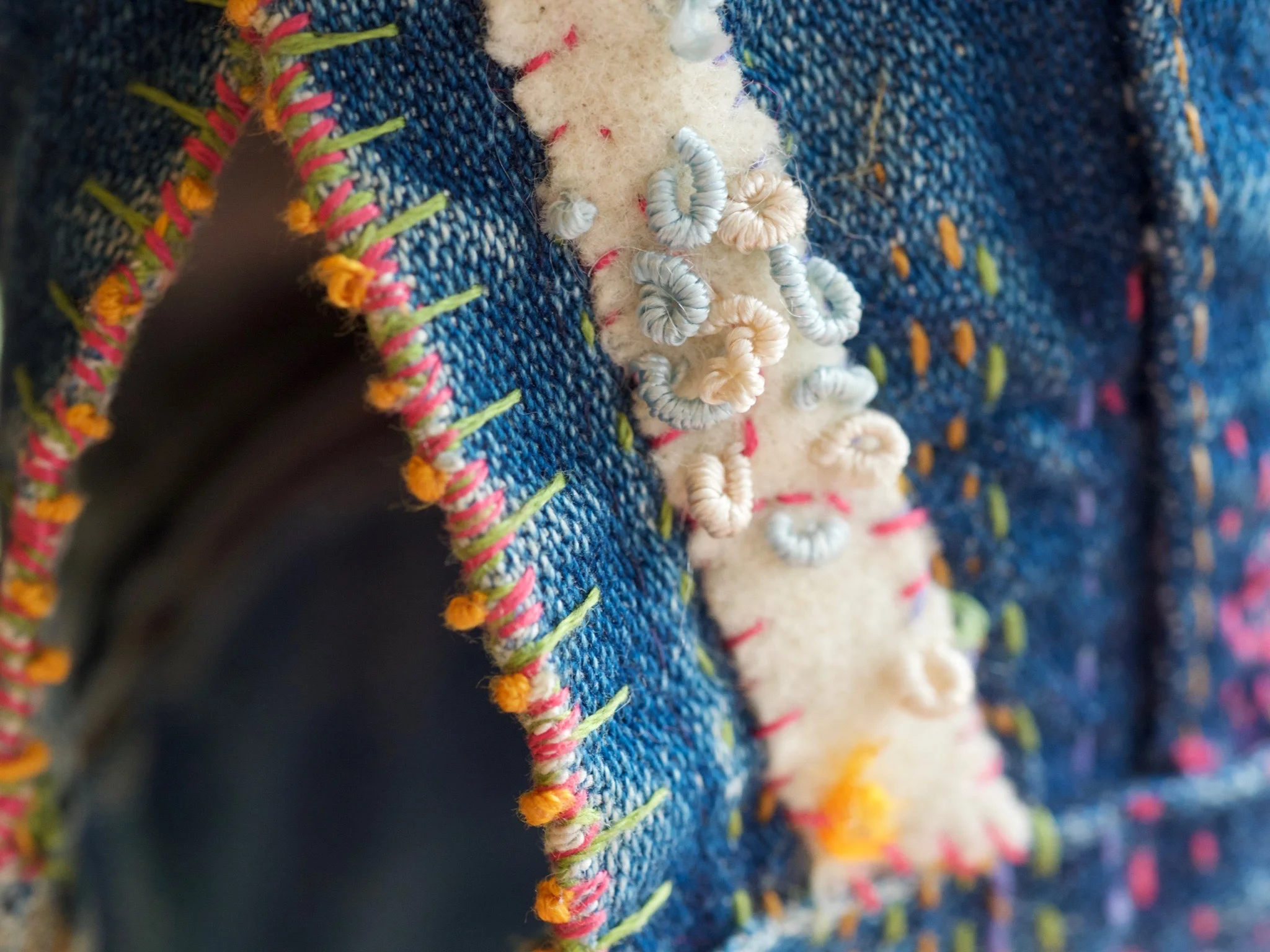 Early on the right cuff separated from the sleeve and for a while I left it that way, liking the idea that its coming apart was evidence that we had both been involved in wearing it out. And, somehow, the physical separation of edges seemed appropriate. Then, caught on a door handle, it ripped. Stitched with colourful threads, and patched with the trimmed edge from an embroidery I had made for my son, it is our continuing bond and a celebration of his life. I decided not to completely stitch up the hole, that felt too final, and a tiny pocket remains. I wear this one most, it feels both timeless and 'out of time'.